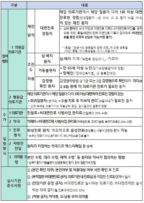 이번 시범사업은 의원급 의료기관에서 대면진료 경험이 있는 재진 환자를 중심으로 시행되며, 섬·벽지 거주자, 장애인 등 거동불편자, 격리 중인 감염병 확진 환자 등은 예외적으로 대면진료 없이도 초진 비대면진료가 가능하다.