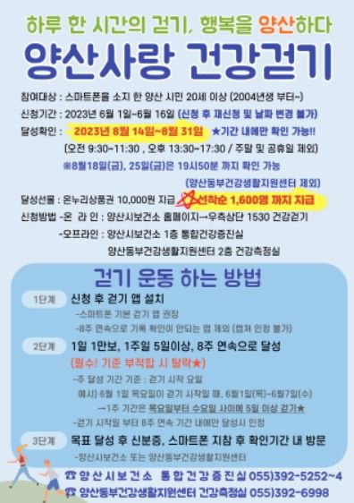 [제주교통복지신문 김강석 기자] 양산시는 건강과 활력을 가져다주는 ‘하루 만보, 일주일에 5일 이상 걷기’『양산사랑 건강걷기사업』 2차 접수를 오는 6월 1일부터 시작한다고 밝혔다.