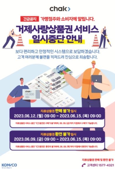 상품권 판매 서비스 중단 기간은 6월 12일(오전 9시)부터 15일(오전 9시)까지로 위 기간 동안 상품권 판매가 불가하며, 6월 15일 오전 9시 이후부터 상품권 판매가 재개된다.