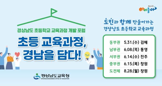 [제주교통복지신문 김강석 기자] 경상남도교육청은 교육공동체‧도민의 수요와 지역의 특색을 담은 초등 교육과정을 개발하기 위해 ‘경상남도 초등학교 교육과정 공개 토론회(포럼)’을 5월 말부터 8월 말까지 5차례 연다.