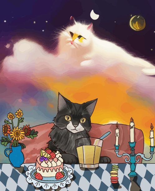 몇몇 작품의 제작 과정을 보면 박다원 교육생은 구름 위로 올라가 달과 별을 바라보는 고양이를 표현하고 싶었다. 이에 인공지능 명령어로 ‘a Cat on a cloud, The cat above the night sky’를 입력했다. 특히 구름 위로 올라간 흰색 고양이와 프러포즈를 하기 위해 그 고양이를 기다리는 검은색 고양이의 두근거리는 순간을 담고 싶다는 박 교육생의 생각을 작품에 불어넣었다.