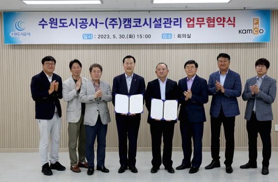 이날 오후 더함파크에서 열린 협약식에는 허정문 수원도시공사 사장, 봉종근 ㈜캠코시설관리 대표이사 등 두 기관 관계자 10여 명이 참석했다.