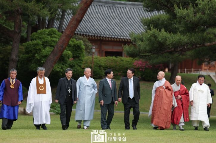 [제주교통복지신문 김강석 기자] 윤석열 대통령은 5. 30일 낮 청와대 상춘재에서 조계종 진우 총무원장과 천태종 덕수 총무원장 그리고 이영훈 한국교회총연합대표회장, 김삼환 명성교회 원로목사, 정순택 천주교 서울대 교구장, 나상호 원불교 교정원장 그리고 최종수 성균관장과 박상종 천도교 교령, 김령하 한국민족종교협의회회장 등 종교 지도자와 오찬을 하면서 취임 이후 지난 1년간의 국정 전반에 대해 설명을 드렸다.