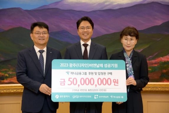 [제주교통복지신문 김강석 기자] 하나금융그룹이 제10회 2023광주디자인비엔날레 성공 개최를 위해 기탁금 3000만원과 통합입장권 2000만원 등 총 5000만원 상당을 (재)광주디자인진흥원에 전달했다.