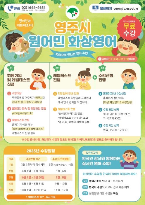 [제주교통복지신문 김강석 기자] 영주시는 6월 한 달간 지역 초·중·고등학생을 대상으로 ‘원어민 화상영어’ 3기 수강생을 모집한다.