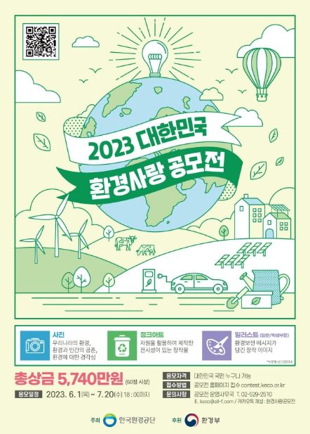 [제주교통복지신문 김강석 기자] 환경부 산하 한국환경공단(이사장 안병옥)은 ‘2023 대한민국 환경사랑공모전’을 개최한다. `대한민국 환경사랑공모전`은 국내 최초의 ‘정크아트공모전(2006년)과 22년 역사의 ’환경보전홍보대상(1996년)‘을 2013년부터 통합하여 매년 개최하고 있는 국내 최대 규모의 환경 분야 공모전이다.