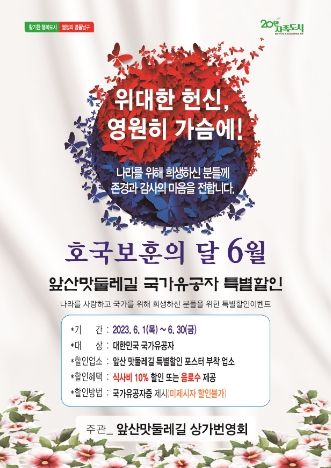 남구는 6월 호국보훈의 달을 맞아 6월 한 달 동안 진행되는 이번 특별할인 행사는 앞산맛둘레길의 34개 식당(할인행사 포스터 부착 식당) 이용 시 국가유공자증을 제시하면 혜택을 받을 수 있다.