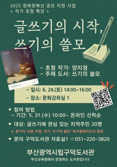 참가 희망자는 5월 31일 오전 10시부터 구덕도서관 홈페이지에서 선착순으로 신청하면 된다. 참가자 중 10명을 추첨하여 ‘쓰기의 쓸모’ 도서도 증정한다. 기타 문의는 구덕도서관 자료실1로 하면 된다.