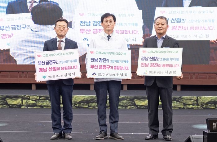 [제주교통복지신문 김강석 기자] 부산 금정구는 허남식 금정구 부구청장, 서순철 강진군 부군수, 김창덕 산청군 부군수가 2023 금정산성 축제에 참여하여 고향사랑기부제 상호 기탁식을 했다고 밝혔다.