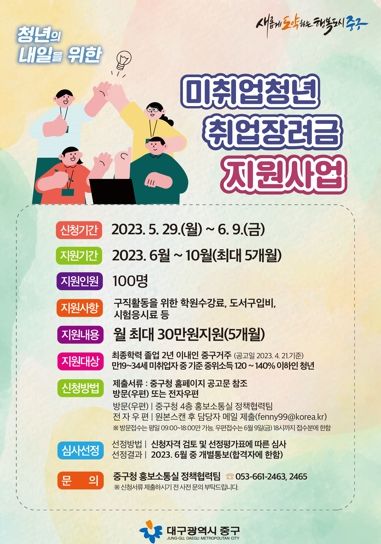 지원 대상은 최종학력 졸업 2년 이내 또는 학사취득 유예 중인 중구 거주(공고일 현재) 만 19 ~ 34세 미취업자 중 기준 중위소득 120~140%이하인 청년이며, 지원 항목은 구직활동을 위한 학원수강료, 교재·도서구입비, 시험 응시료 등으로 최대 100명에게 월 최대 30만원 한도 내에서 5개월 동안 지원한다.
