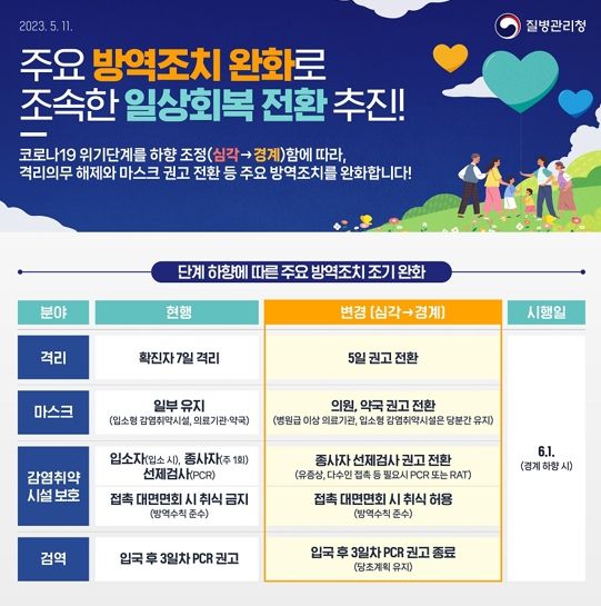 방역 정책 완화 사항으로는 △확진자 7일 의무 격리에서 5일 격리 권고(입원 환자, 감염취약시설 입소자는 7일) △의원·약국 등 실내 마스크 전면 권고 전환(병원급 의료기관, 감염 취약 시설 착용 의무 유지) △입국 후 3일 차 PCR검사 권고 종료 △감염취약시설 면회 시 취식 허용 및 종사자 선제 검사 권고 전환 등이다.