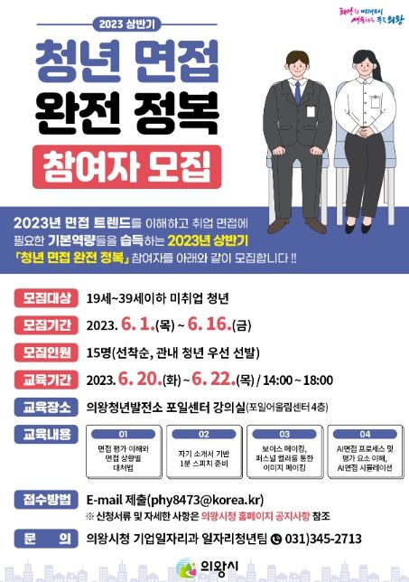 [제주교통복지신문 김강석 기자] 의왕시는 관내 청년 구직자를 위한 취업 지원프로그램인 ‘청년 면접 완전 정복’ 참여자를 모집한다고 밝혔다.