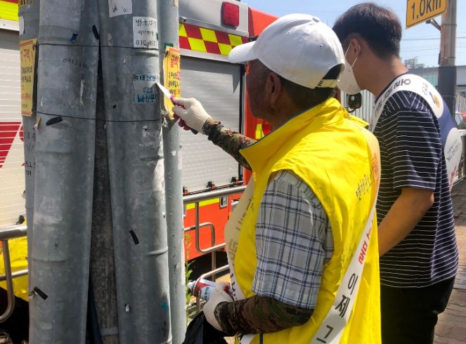 ‘불법광고물 이제 그만’이라는 어깨띠를 두른 어르신과 군공무원 15명은 정비반을 구성해 올 10월 말 개통 예정인 전곡역 주변의 전주, 가로등 등에 부착된 벽보와 전단지 등을 집중 정비했다.