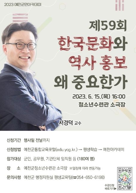 [제주교통복지신문 김강석 기자] 예천군은 오는 6월 15일 오후 4시 청소년수련관 소극장에서 서경덕 성신여자대학교 교수를 초청해 ‘제59회 예천군민아카데미’를 개최한다.