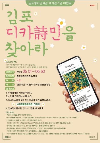 참여할 때는 ‘#김포평화문화관_디카시’라는 해시태그를 반드시 넣어야 하며, 김포평화문화관 계정을 태그하면 된다. 김포문화재단은 디카시를 완성해 업로드 한 시민 중 100명을 선정해 모바일 상품권을 증정할 계획이다.