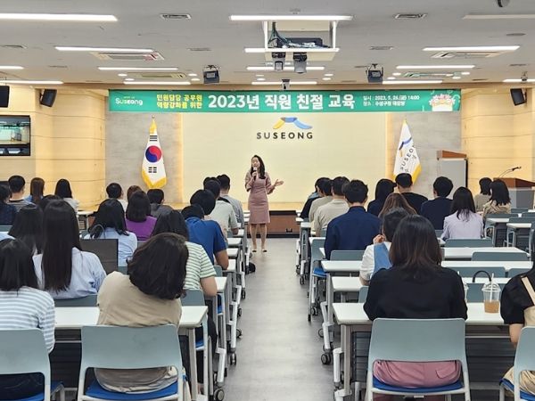 [제주교통복지신문 김강석 기자] 대구 수성구는 지난 26일 구청 대강당에서 민원 담당 공무원 등 150여 명을 대상으로 ‘직원 친절 교육’을 실시했다.