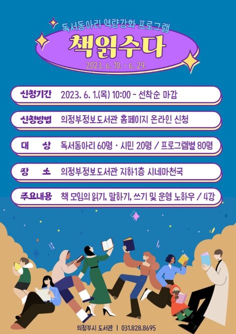 [제주교통복지신문 김강석 기자] 의정부시는 독서동아리의 자립성 향상 및 책 읽는 지역사회 분위기 조성을 위해 독서동아리 역량강화 프로그램 ‘책읽수다’를 6월 10~29일 총 4회에 걸쳐 의정부정보도서관에서 운영한다.