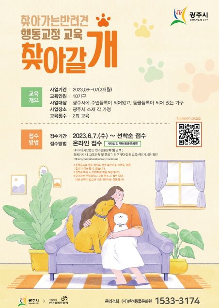 ‘찾아갈개’는 행동교정이 필요한 반려견을 키우고 있는 관내 거주 반려인 가정에 전문 강사가 가구당 2회 방문교육을 진행한다. 반려견을 키울 때 필요한 기초이론, 규칙 수립, 생활환경 조성 및 재배치, 문제행동 교정교육 등에 대해 교육한다. 교육 신청은 7일부터 사단법인 반려동물문화원 홈페이지에서 선착순으로 진행되며, 신청가구의 반려견이 동물등록이 돼 있어야 참여가 가능하다.