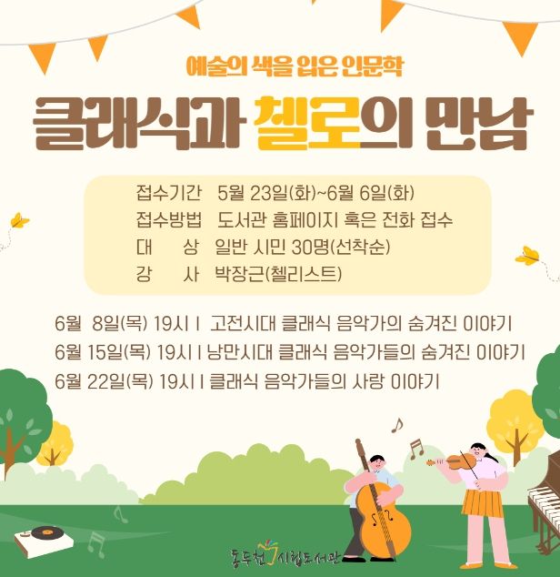[제주교통복지신문 김강석 기자] 동두천시 평생교육원 시립도서관은 6월 클래식을 주제로 한 예술의 색을 입은 인문학 야간 강연을 개최한다고 밝혔다.