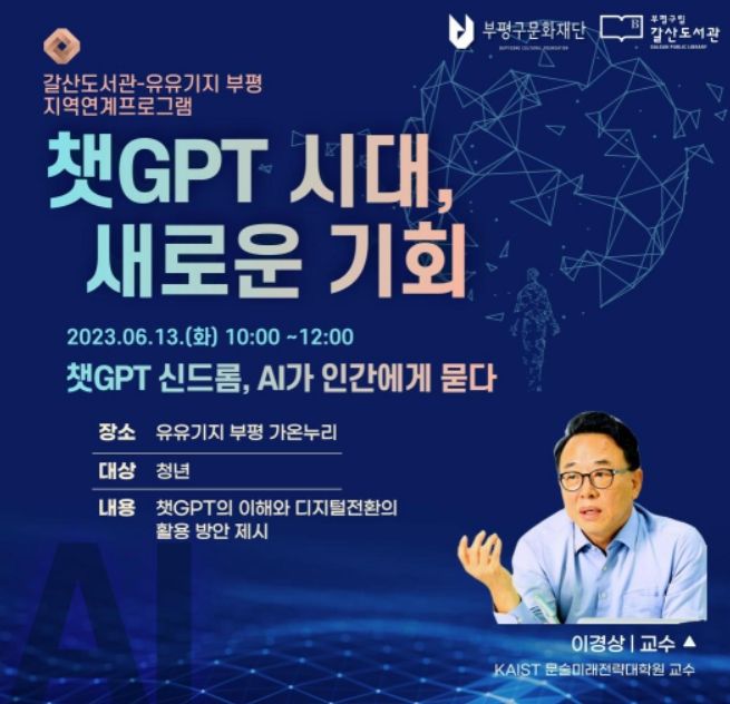 [제주교통복지신문 김강석 기자] 인천시 부평구 갈산도서관은 13일 유유기지 부평 가온누리에서 청년 40명을 대상으로 ‘챗GPT 신드롬, AI가 인간에게 묻다’ 강연을 진행한다.