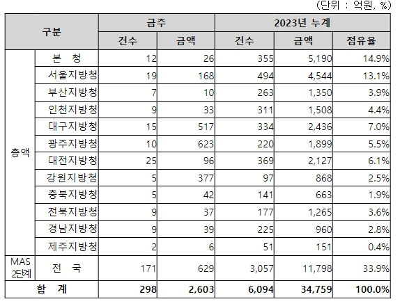 지역별 발주량을 보면, 총액계약 대상 1,974억 원 중 본청이 26억 원으로 1.3%를 집행하고 서울청 등 11개 지방청에서 1,948억 원을 각각 집행할 예정이다.