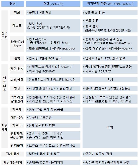 중앙방역대책본부는 이번 위기단계 하향과 ‘자율 및 권고’ 기조로의 방역조치 전환은 코로나19 일상적 관리체계의 시작점을 의미하는 것으로, 향후 인플루엔자와 같이 엔데믹화 되어 상시적인 감염병 관리가 가능한 시기까지 안정적으로 위기단계 조정 로드맵을 이행하고 국민의 건강을 보호하기 위한 책무를 다할 것이라고 밝혔다.