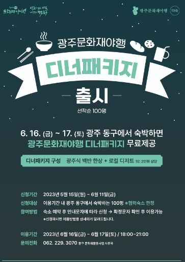 참여 방법은 6월 15~18일 협력 숙박업소 이용객에 한해 예약 확정 후 숙박업소로부터 발송되는 안내 문자를 통해 접수하면 된다. 이들 중 선정된 100명은 광주문화재야행 개최 기간 동안 오후 6~10시까지 디너 패키지를 이용할 수 있다.
