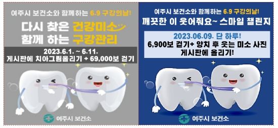 [제주교통복지신문 김강석 기자] 여주시 보건소는 구강보건의 날(6월9일)을 맞아 오는 6월 1일부터 11일까지 모바일 걷기 앱(워크온)을 활용한 『다시 찾은 건강미소 함께 하는 구강관리』, 『깨끗한 이 웃어줘요~ 스마일』 챌린지를 운영한다고 31일 밝혔다.