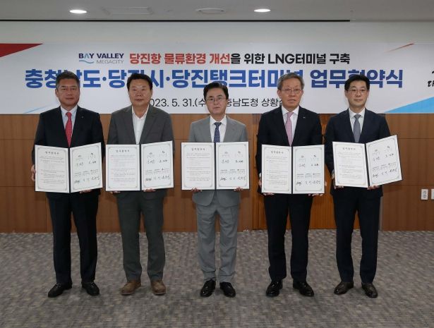 김태흠 지사와 오성환 당진시장은 이날 도청 상황실에서 김준형 당진탱크터미널㈜ 대표, 정탁 포스코인터내셔널 대표, 윤춘성 LX인터내셔널 대표와 액화천연가스 터미널 구축 업무협약을 체결했다.