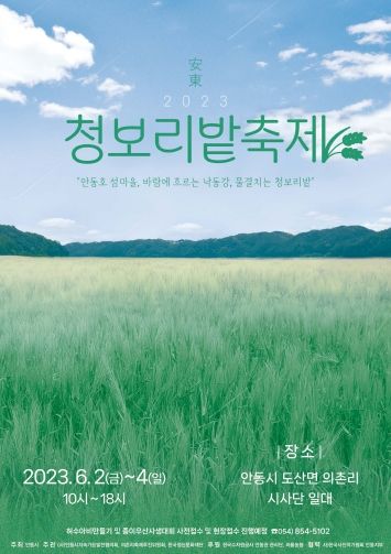 [제주교통복지신문 김강석 기자] 푸른 청보리밭이 펼쳐진 안동시 도산면 의촌리 일대에서 6월 2일부터 4일까지 2023 안동 청보리밭 축제가 개최된다. 안동 청보리밭 축제는 지난 2018년 1회를 시작으로 2019년에 2회를 개최하고, 이후 코로나 19 확산 방지와 강의 수위 변화로 지난 3년간은 개최하지 못했다.
