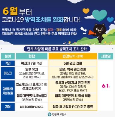 [제주교통복지신문 김강석 기자] 김천시는 중앙대책본부가 6월 1일을 기점으로 코로나19 위기 경보 수준을 ‘심각→경계’로 하향 조정하기로 한 결정에 따라 완화되는 주요 방역 조치 사항을 안내했다.