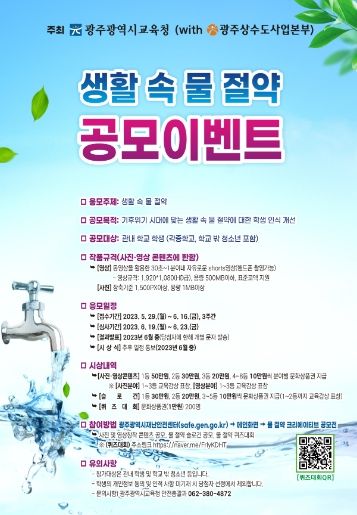 [제주교통복지신문 김강석 기자] 광주시교육청이 이번 달 29일~다음 달 16일 생활 속 물 절약 공모전을 실시한다.