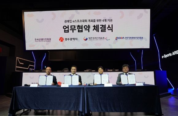 [제주교통복지신문 김강석 기자] 광주광역시는 한국콘텐츠진흥원, 대한장애인체육회, 광주정보문화산업진흥원과 함께 ‘장애인 이스포츠 대회’ 개최를 위한 업무협약을 5월 31일 광주 이스포츠경기장에서 체결했다.