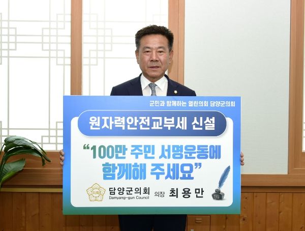 [제주교통복지신문 김강석 기자] 담양군의회 최용만 의장은 지난 26일 장성군의회 고재원 의장에 이어 “원자력안전 교부세신설촉구 100만 주민 서명운동 챌린지”에 함께 했다.