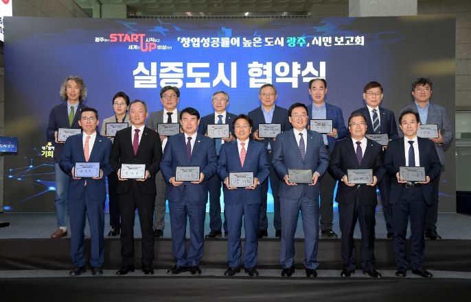 이날 보고회에서는 ‘실증도시 광주’의 출발을 알리기 위해 창업기업 실증지원 사업에 참여하는 광주시, 교육청, 5개 자치구, 전남대·조선대, 전남대병원·조선대병원, 시 산하기관 등 24개 기관이 참여하는 ‘실증도시 광주선언 협약식’도 진행됐다.