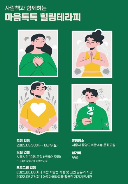[제주교통복지신문 김강석 기자] 시흥시 중앙도서관은 이달에 진행 예정인 ‘사람책과 함께하는 마음톡톡 힐링 테라피’ 프로그램 신청자를 5월 31일부터 모집한다.