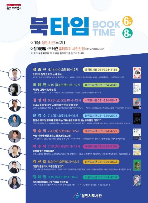 용인특례시는 다양한 분야 저자들과 책을 통해 소통하는 ‘북타임’ 특강이 오는 14일부터 관내 8곳 공공도서관에서 열린다고 1일 밝혔다.