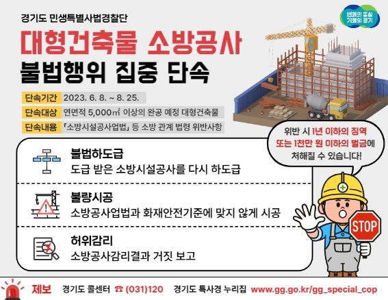 [제주교통복지신문 김강석 기자] 경기도 민생특별사법경찰단이 6월 8일부터 8월 25일까지 도내 신축 대형 건축물을 대상으로 소방 시설 공사 전반에 대한 위법행위를 집중 단속한다.