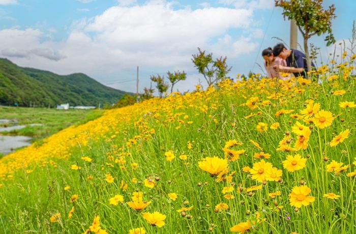 양천강변에서 화현리까지 4㎞ 가량 이어진 둑길은 금계국과 산수유, 배롱나무 등이 어우러져 많은 탐방객이 찾고 있다.