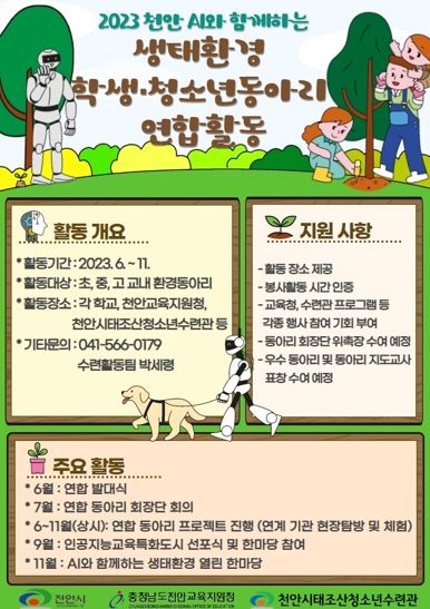 [제주교통복지신문 김강석 기자] 천안시태조산청소년수련관은 ‘2023 천안 인공지능(AI)과 함께하는 생태환경 학생·청소년 동아리 연합활동’을 운영한다.