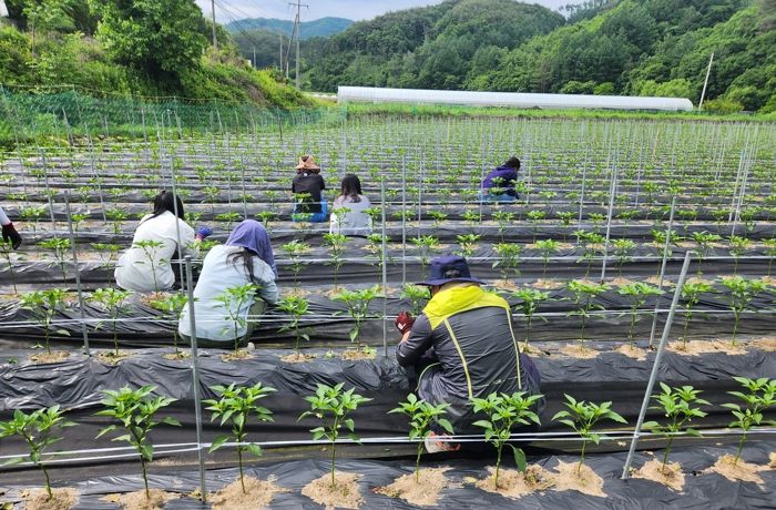 고추 순 제거와 고추밭 풀베기는 일일이 사람의 손으로 제거 해야하는 번거로운 작업이기에 일손돕기가 꼭 필요하다.
