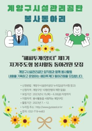 [제주교통복지신문 김강석 기자] 인천시 계양구시설관리공단은 지역과 주민에게 나눔을 실천하기 위한 봉사동아리 ‘해피투계(양)더’ 1기 동아리원을 모집한다고 1일 밝혔다.