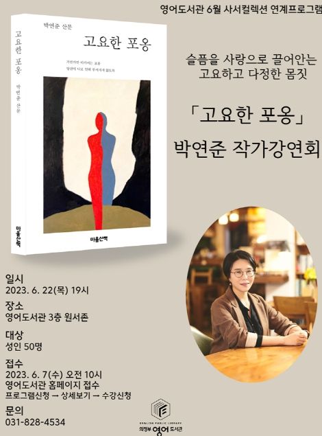 [제주교통복지신문 김강석 기자] 의정부시는 6월 22일 의정부영어도서관에서 산문집 '고요한 포옹'의 박연준 시인 초청 강연회를 개최한다.