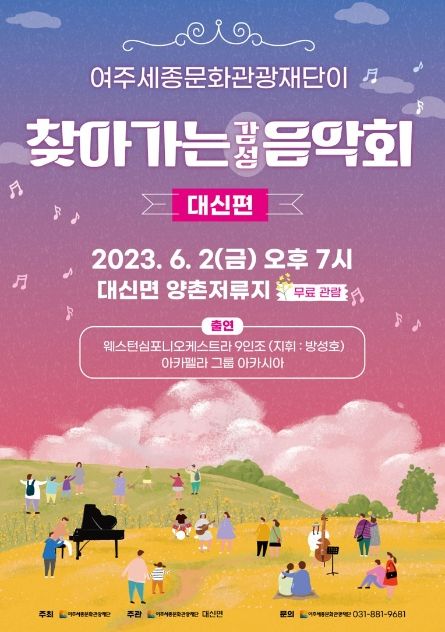 [제주교통복지신문 김강석 기자] 여주세종문화관광재단이 오는 6월 2일(금), 대신면 양촌저류지에서 '찾아가는 음악회 – 대신편'을 선보인다.