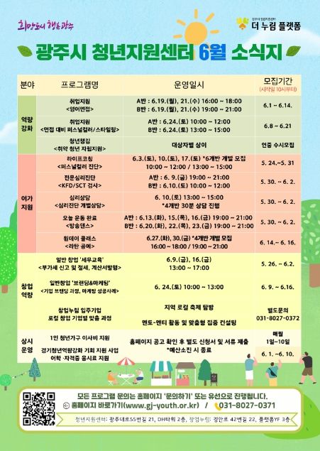 [제주교통복지신문 김강석 기자] 광주시 청년지원센터‘더누림 플랫폼’은 6월을 맞아 청년의 여가 활동과 취업 지원 교육 등을 통해 청년의 주도적인 삶을 지향하는 다양한 프로그램을 실시한다.