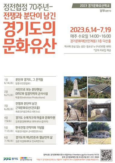 [제주교통복지신문 김강석 기자] 경기문화재단 경기문화재연구원(원장 이지훈)은 정전협정 70주년을 맞이하여 '전쟁과 분단이 남긴 경기도의 문화유산'이라는 주제로 상반기 2023 경기문화유산학교를 진행한다.