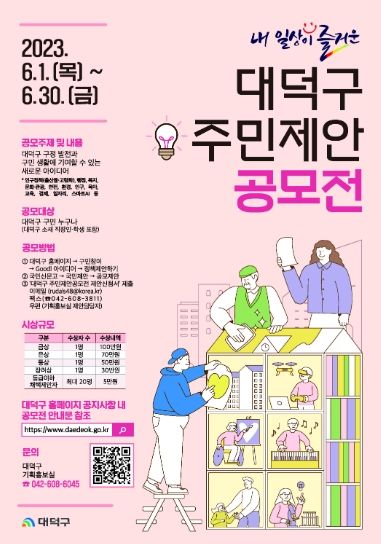 [제주교통복지신문 김강석 기자] 대전 대덕구가 복지, 안전, 환경, 교육 등 구민들의 편안하고 행복한 삶을 위해 오는 30일까지 ‘내 일상이 즐거운 대덕구를 위한 주민 제안 공모전’을 실시한다.