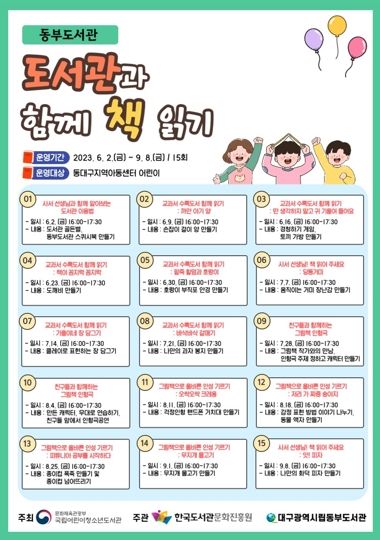 [제주교통복지신문 김강석 기자] 대구동부도서관은 국립어린이청소년도서관이 주최하는 '2023년 도서관과 함께 책 읽기' 공모사업에 선정되어 6월 2일부터 9월 8일까지 지식정보취약계층 어린이를 위한 독서문화 프로그램을 운영한다고 밝혔다.