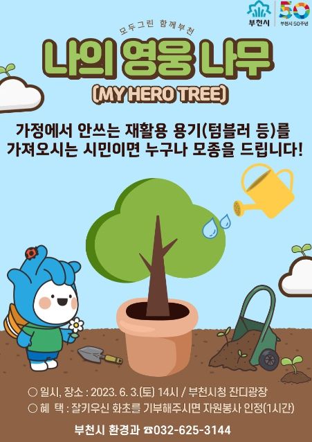 [제주교통복지신문 김강석 기자] 부천시는 가정에서 쓰지 않는 재활용 용기를 가져오면 모종으로 바꿔 주는 ‘나의 영웅나무(MY HERO TREE) 만들기’ 행사 부스를 오는 6월 3일 시청 잔디광장에서 운영한다고 밝혔다.