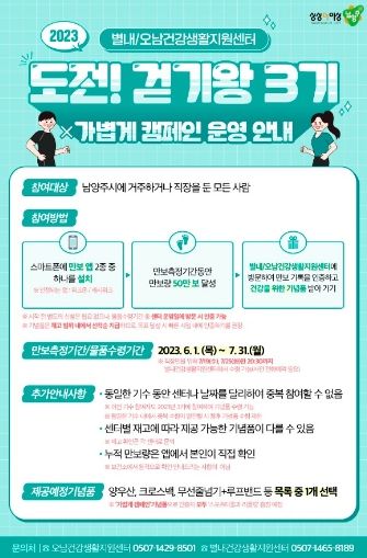 [제주교통복지신문 김강석 기자] 남양주풍양보건소는 1일부터 지역주민을 대상으로 비만 예방에 대한 인식 개선 및 건강생활실천을 도모하고자 기존에 운영하던 만보 걷기 프로그램 ‘도전! 걷기왕’에 더해 ‘가볍게 걷고 마시고 줄이자’라는 주제로 비만 예방 캠페인을 운영한다.
